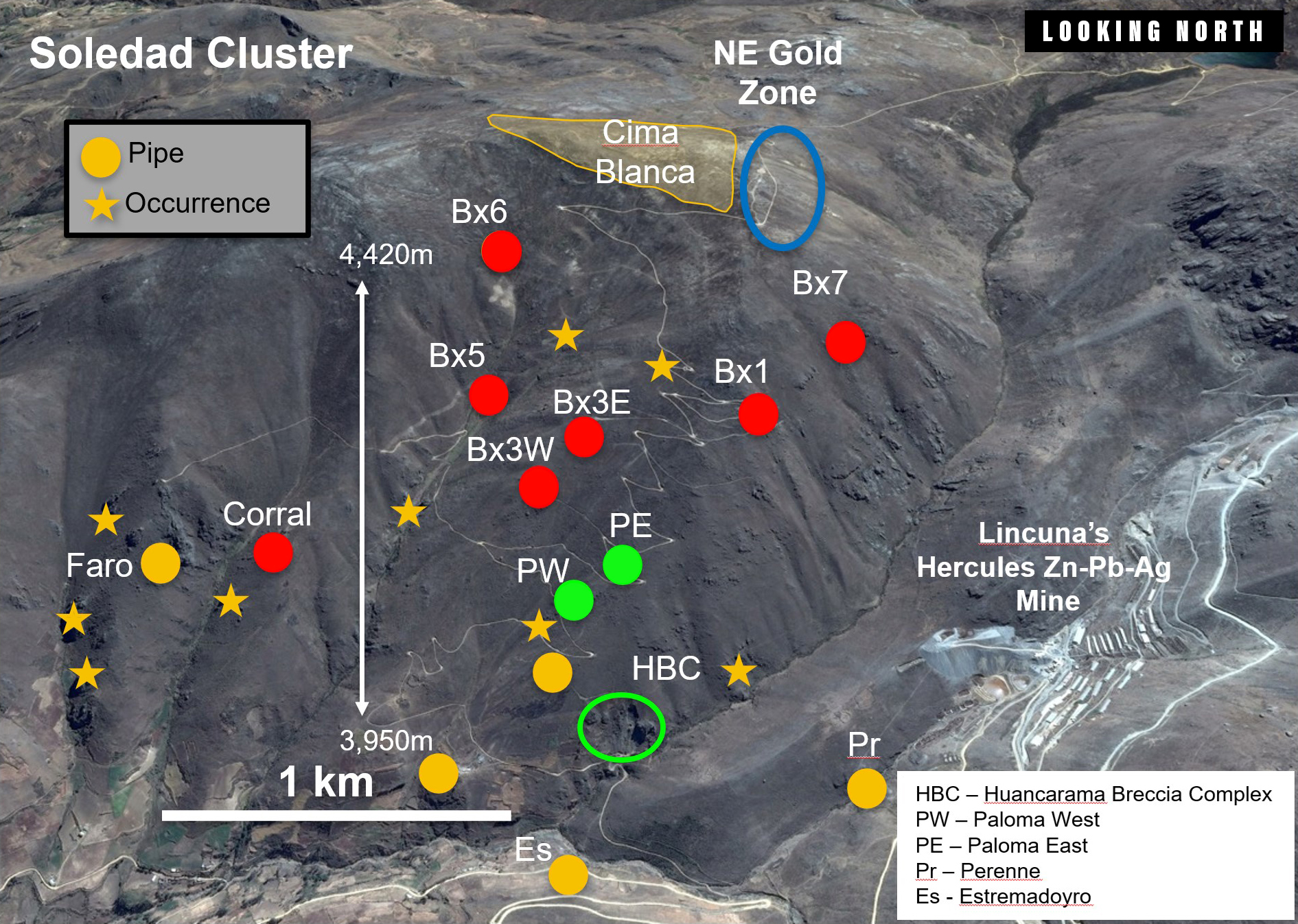 “The discovery of a second high-grade tourmaline breccia pipe within the Huancarama Breccia Complex is an exciting development for the project. The drill rig was set up 50m north of the H5 breccia in an area with andesitic tuff exposed at surface. High-grade gold and silver mineralization was encountered about 3m below surface, demonstrating the significant potential of near-surface mineralization at Soledad. The precious metal-rich nature of the mineralization may be related to oxidation but also primary zonation. Often breccias at Soledad become strongly mineralized at depth with copper in addition to precious metals.”